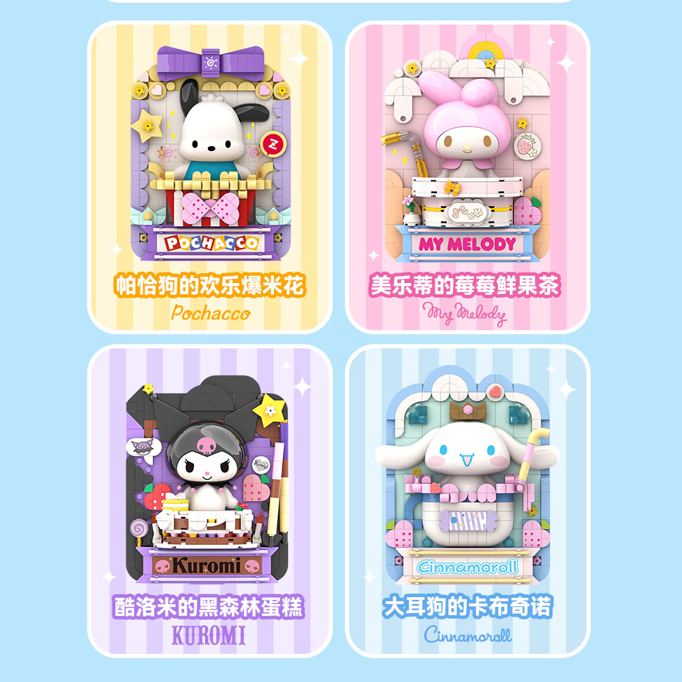 大耳狗+卡布奇諾,酷洛米+黑森林蛋糕,美樂蒂+莓莓鮮果茶,帕恰狗+爆米花,根據三麗鷗小伙伴的個性特點,搭配不同美食,突顯Q萌,向人們傳遞享受美食的幸福。
