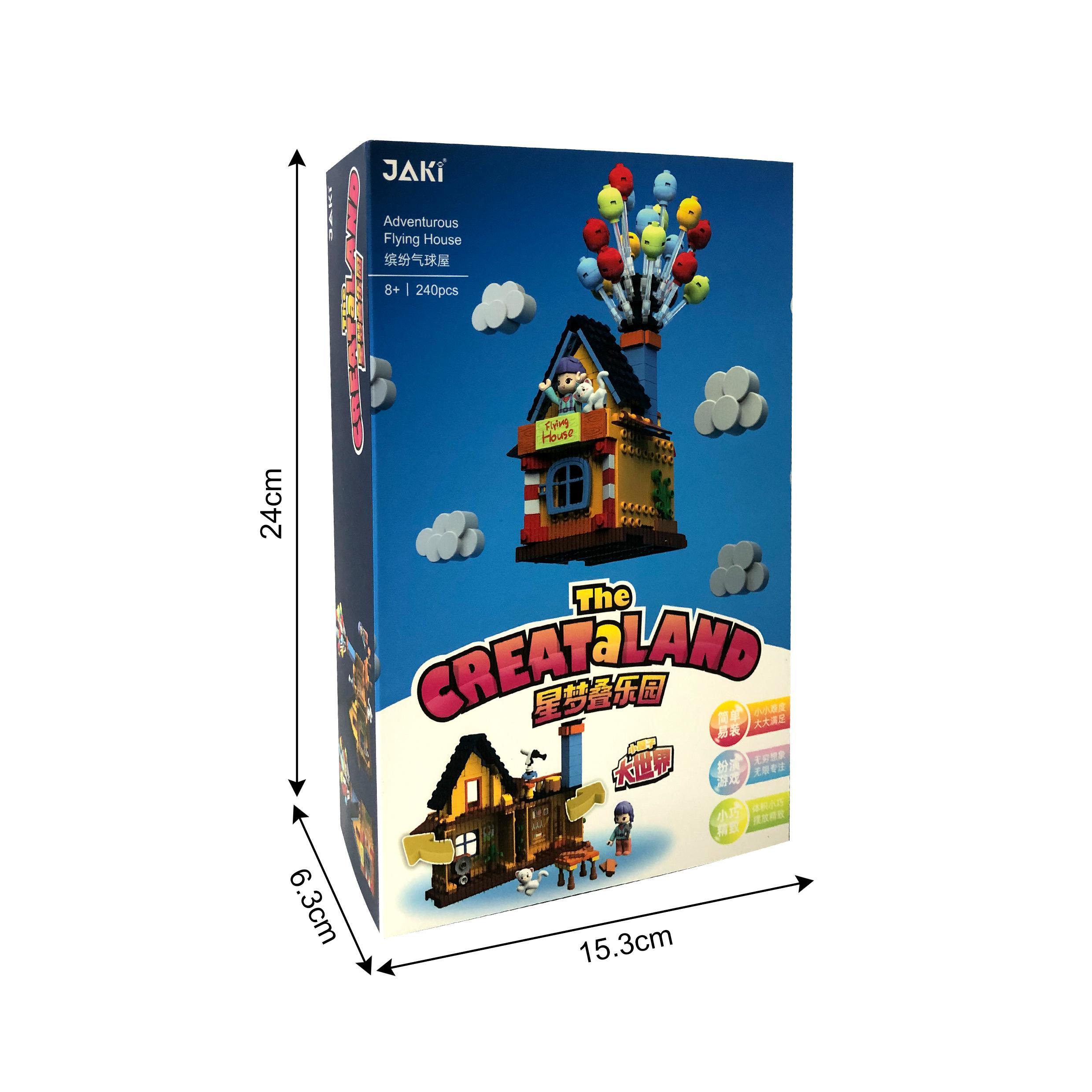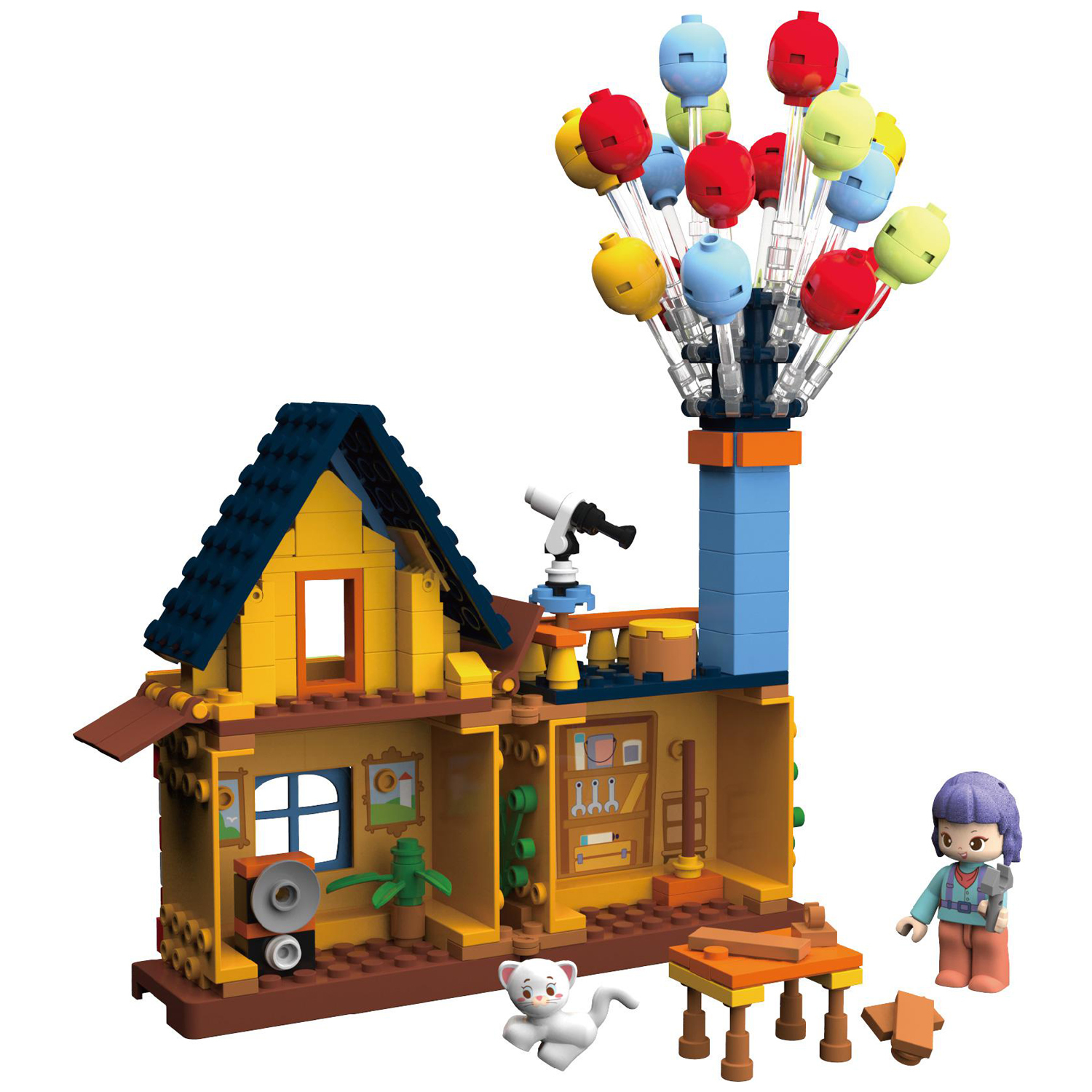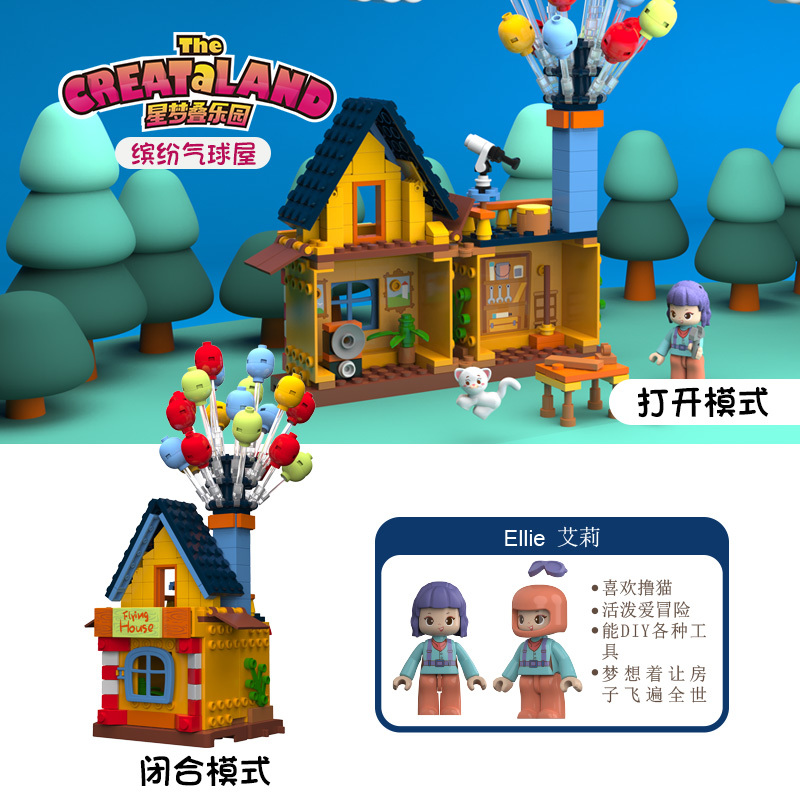 看過《飛天環游記》的小孩子也許會想,自己家的小屋子如果也能系上氣球,朝著夢想飛去那該有多好?,F在就讓繽紛氣球屋來實現孩子們的小小心愿吧!首先,我們需要先把小屋子拼搭出來,這是一所雙層小屋,小屋上邊還有一個長長的煙囪。讓小屋飛起來可是一項偉大的工程項目,找找看工具箱里有哪些我們需要的工具吧!爬上二樓的瞭望臺,望遠鏡可以幫助我們制定路線,一切準備就緒,在煙囪上插上氣球,準備起飛吧!