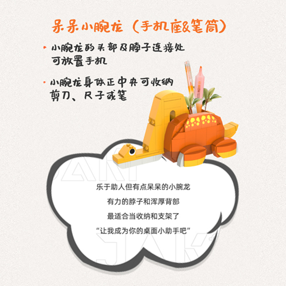 小腕龍的頭部及脖子連接處可放置手機(jī), 小腕龍身體正中央可收納剪刀、尺子或筆。